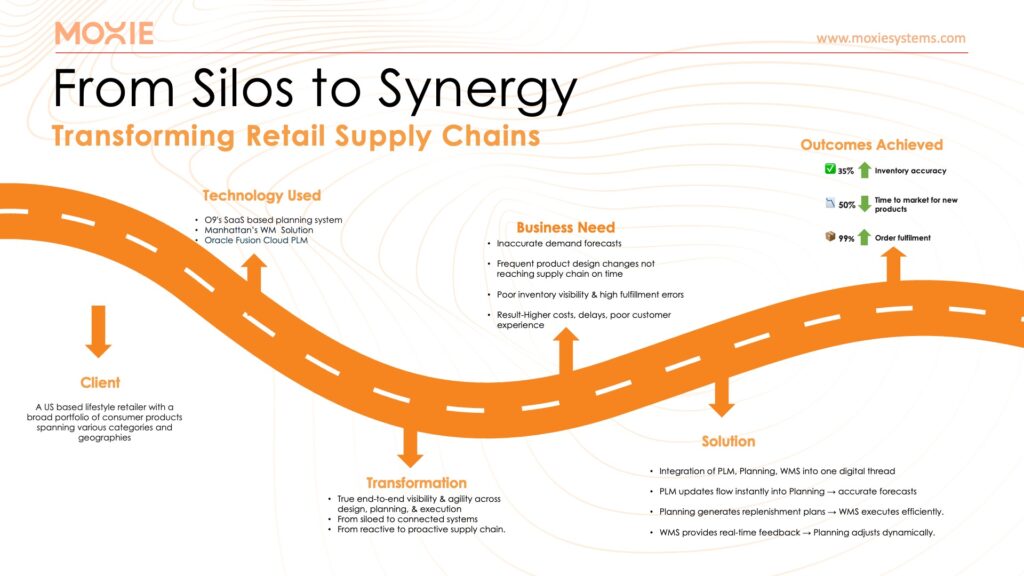 A U.S.-based lifestyle retailer struggling with inaccurate forecasts and fulfillment delays integrated its Planning, PLM, and WMS systems into a single digital thread.